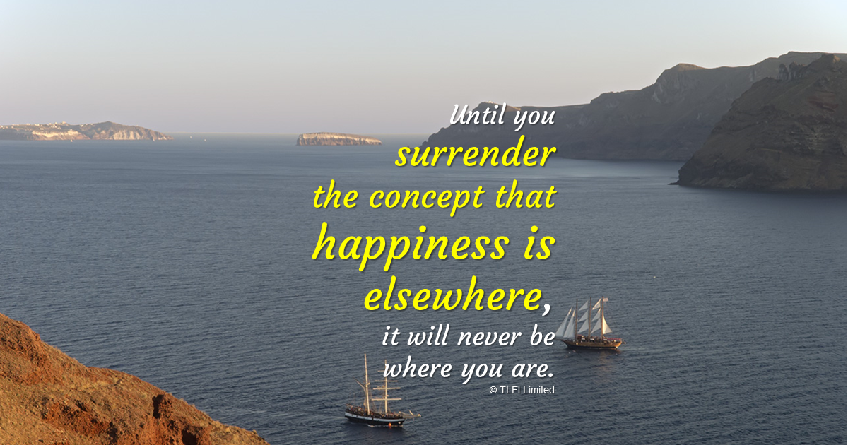 Be mindful of the destination dependency; where it becomes a fixation with the notion that happiness is elsewhere. That happiness can be magically found at your next destination, at your next job or even with a different companion. Until you surrender the concept that happiness is in another place, it is going to never be where you are.