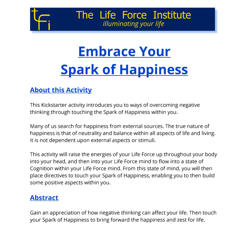 This Kickstarter activity introduces you to ways of overcoming negative thinking through touching the Spark of Happiness within you.